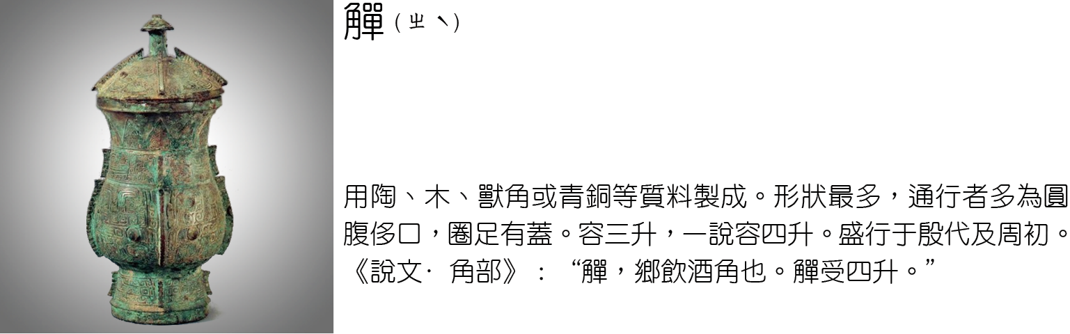 飲酒器主要包括有爵、角、觥、觚、觶、杯等;